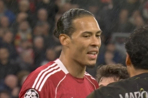体育资讯4月15日讯 利物浦vs巴黎上半场,范戴克门前补射被马尔基尼奥斯极限铲球封堵,起身后范戴克对同行点头称赞。